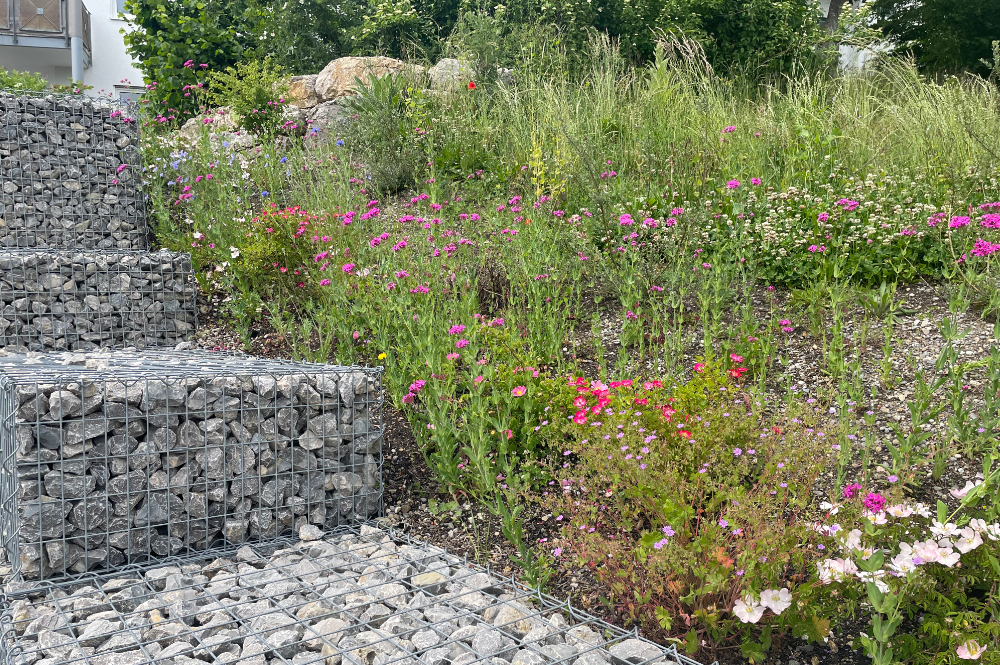 Der Zugangsbereich wird durch hohe Gräser und Stauden gefasst, entlang der Betonmauer sorgt eine mehrjährige Wildblumenhecke für Struktur und zur westlichen Nachbarschaft dient eine blühende Zwergstrauchhecke als Puffer. Im oberen Bereich stabilisieren begrünte Gabionen den Hang, während trockenheitsresistente Kräuter die Pflasterfugen und ein artenreicher Magerrasen die Parkplätze umrahmen.